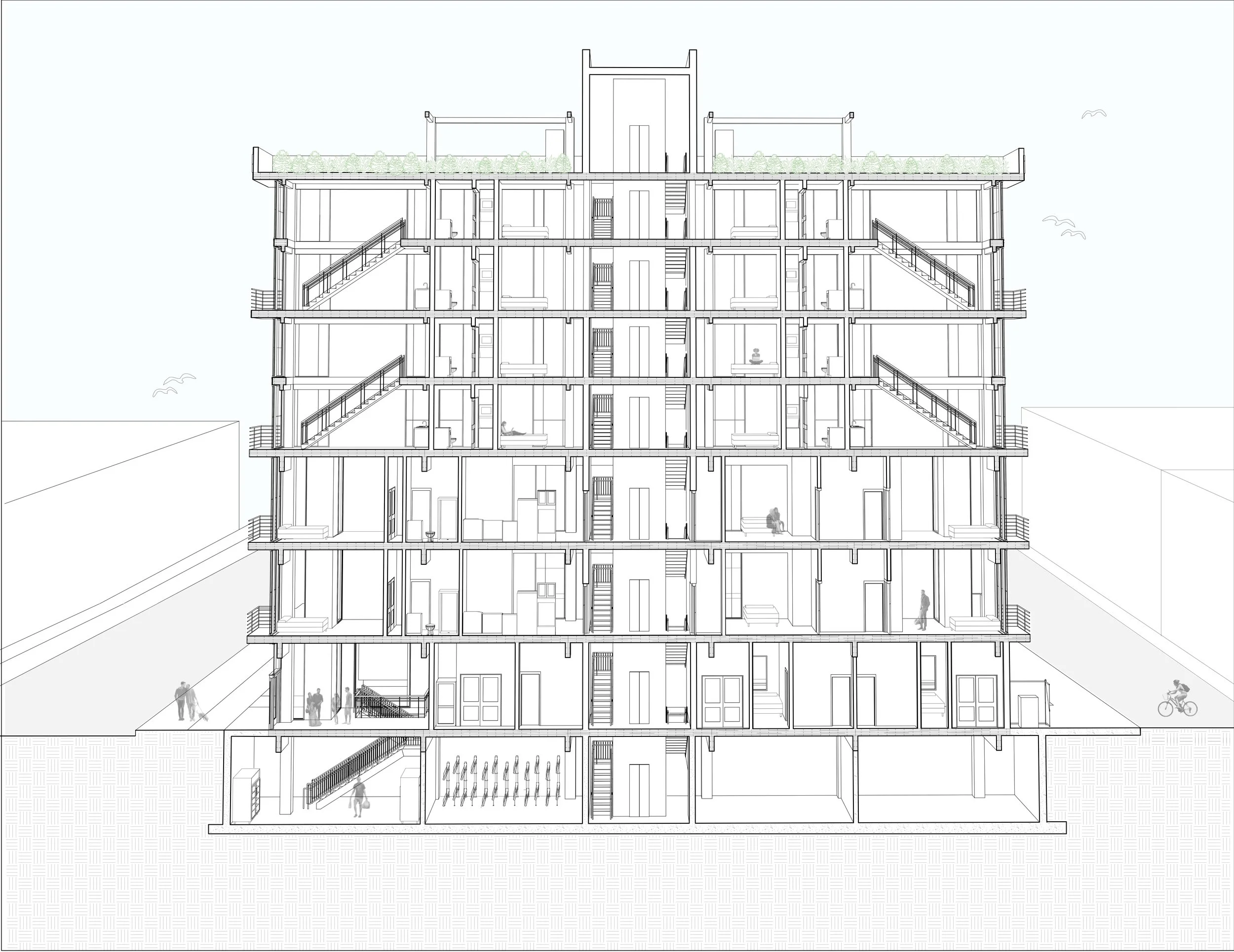 The mass timber building features a range of unit types that cater to both young professionals and families, including lofted units that allow for more space under a code technicality. We also implemented a myriad of sustainability methods, such as rainwater capturing, solar panel louvers that also reduce solar heat gain, and cross ventilation for reduced HVAC dependency. Furthermore, food for the residents and the local community is produced on the green roof and sold in the commercial space located on the ground floor of the project. Overall, our project reckons with outdated regulations that have fueled the housing crisis by limiting flexibility and affordability in urban housing design and showcases how this can begin to change.